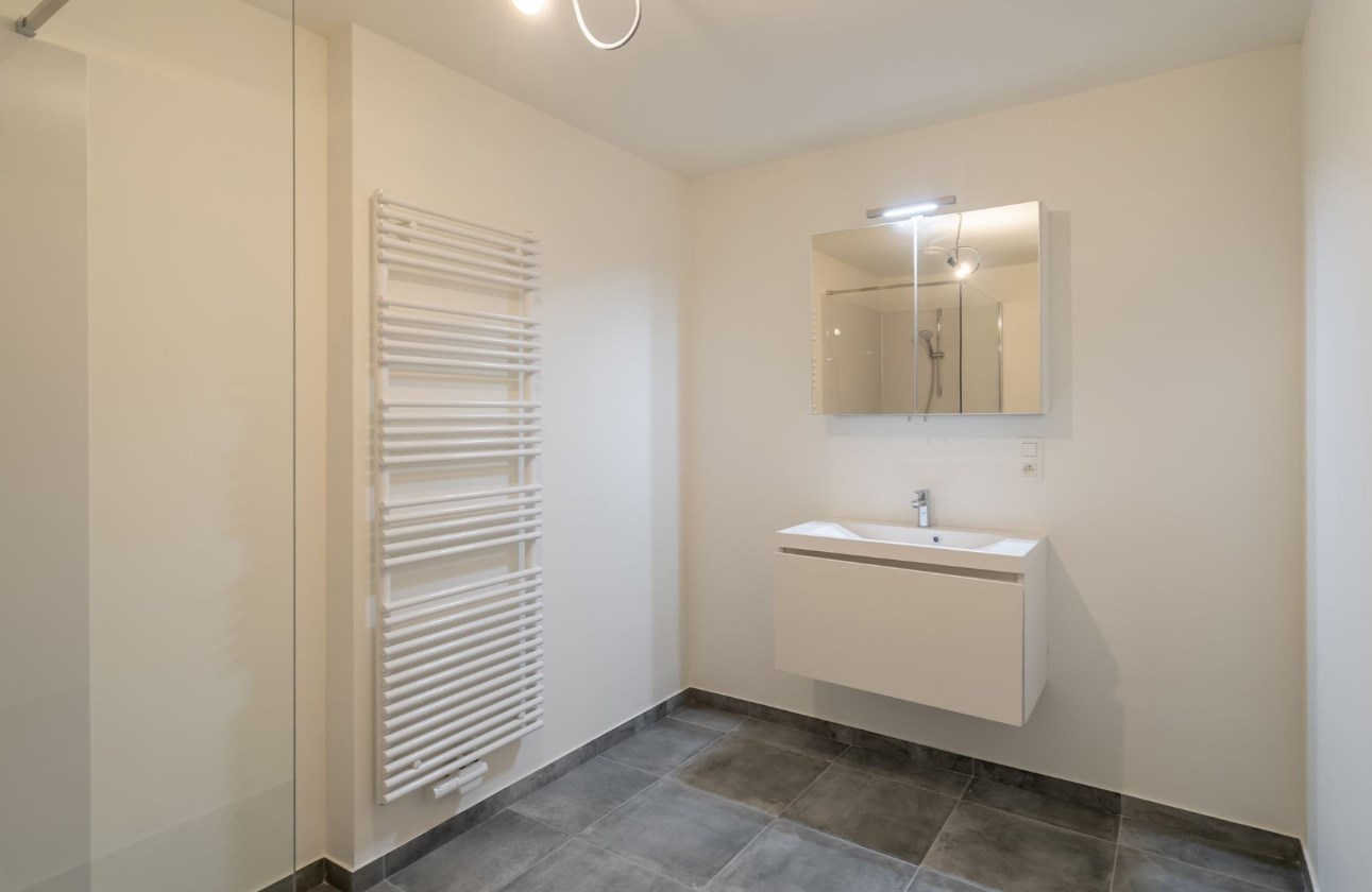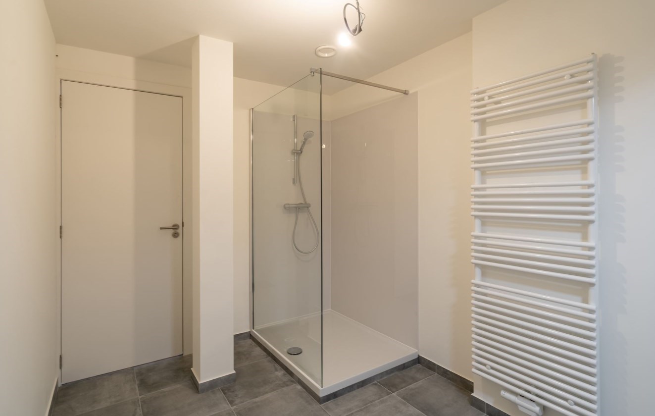 Inkomhal, toilet, berging, woonkamer, tuin of terras, keuken, eetkamer, 2 slaapkamers, badkamer met inloop douche, toilet en lavabo waarvan alles nieuw is en een kelderberging.