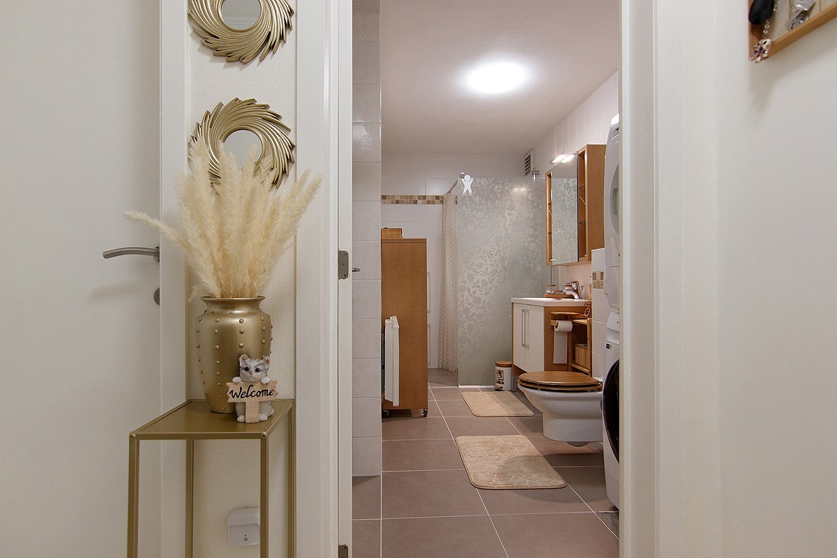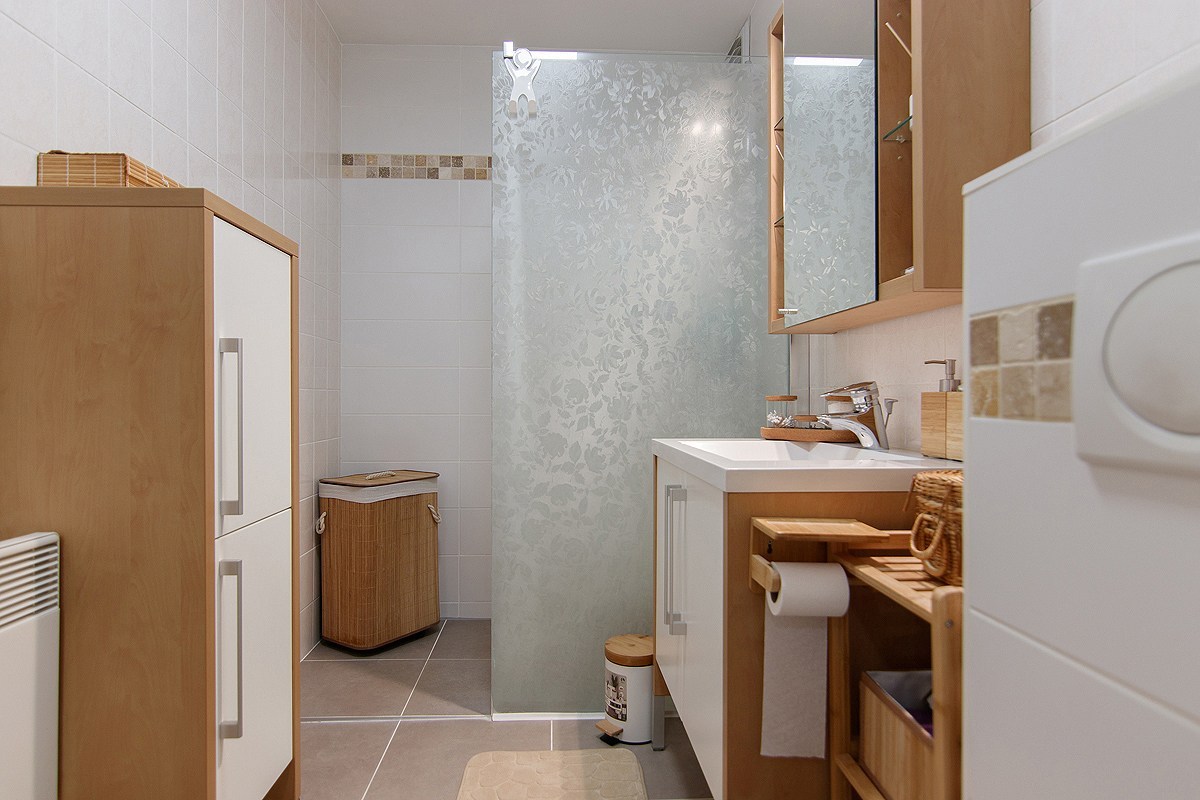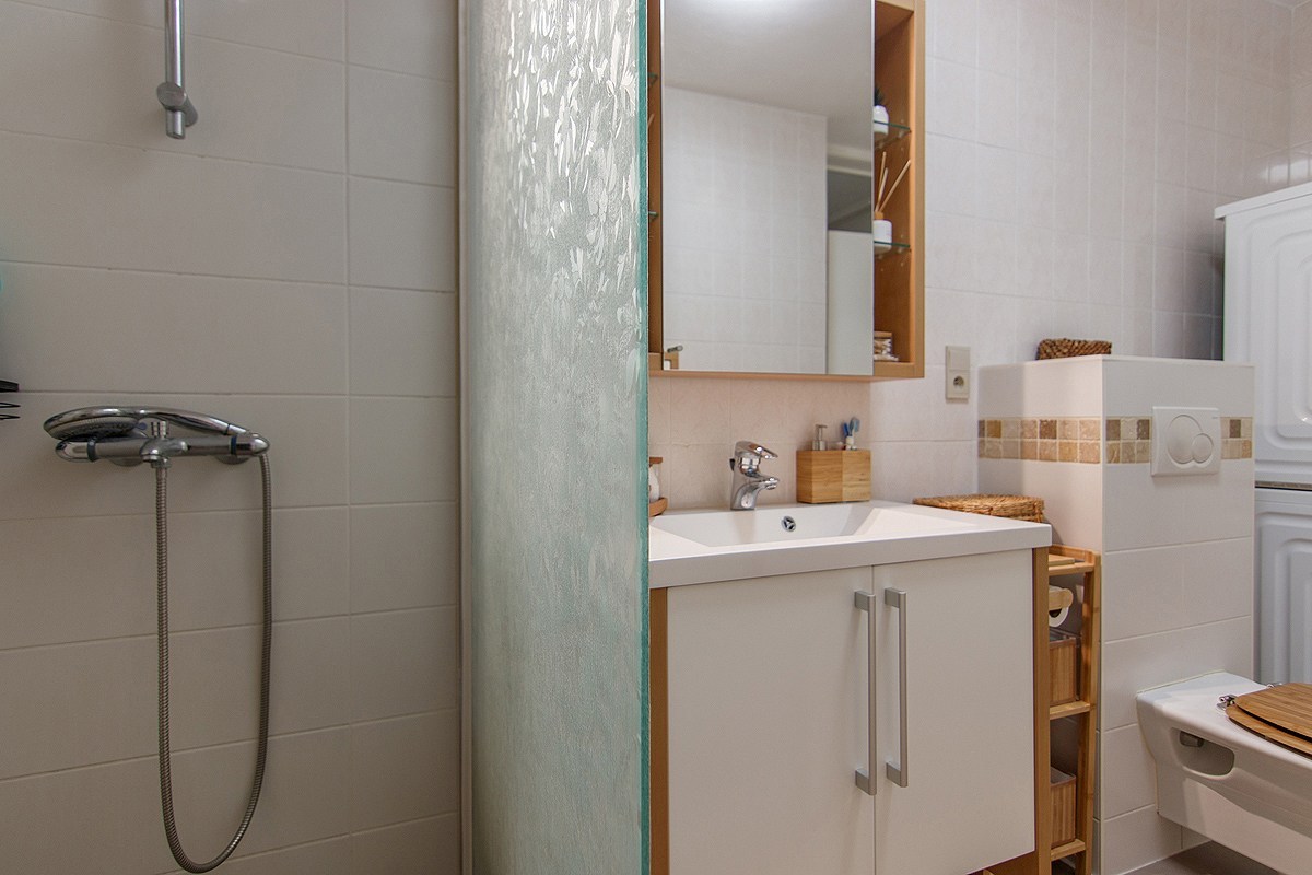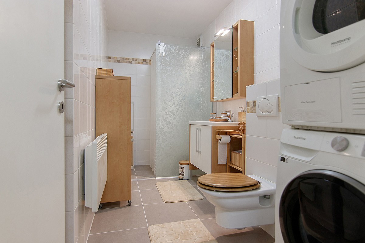 De badkamer is uitgerust met douche, lavabo en toilet.