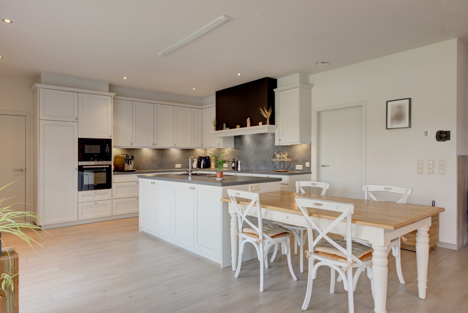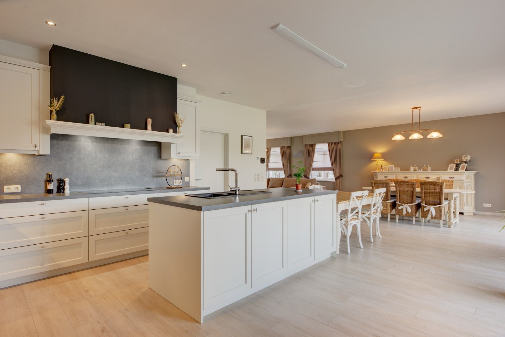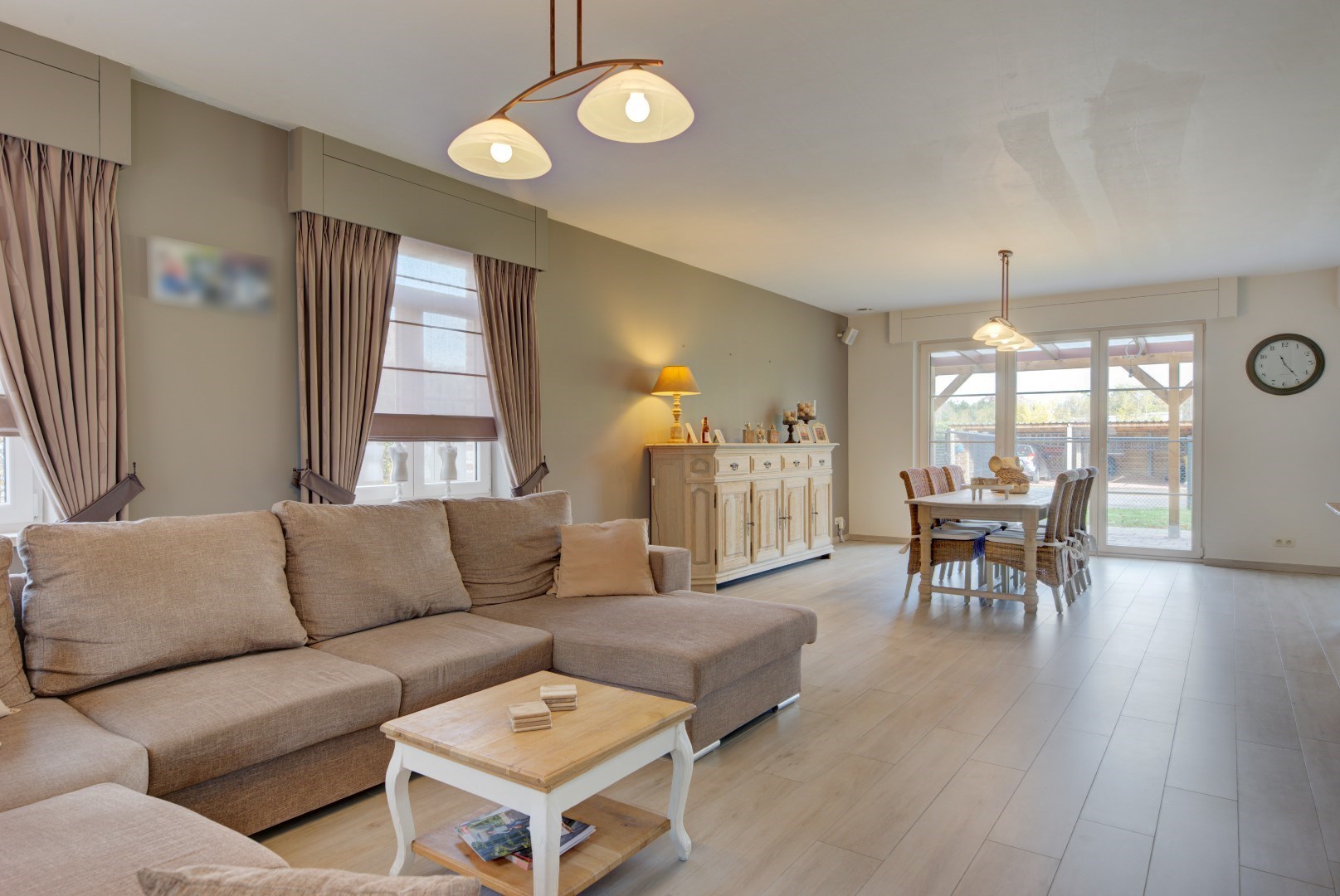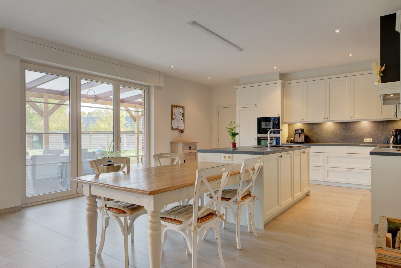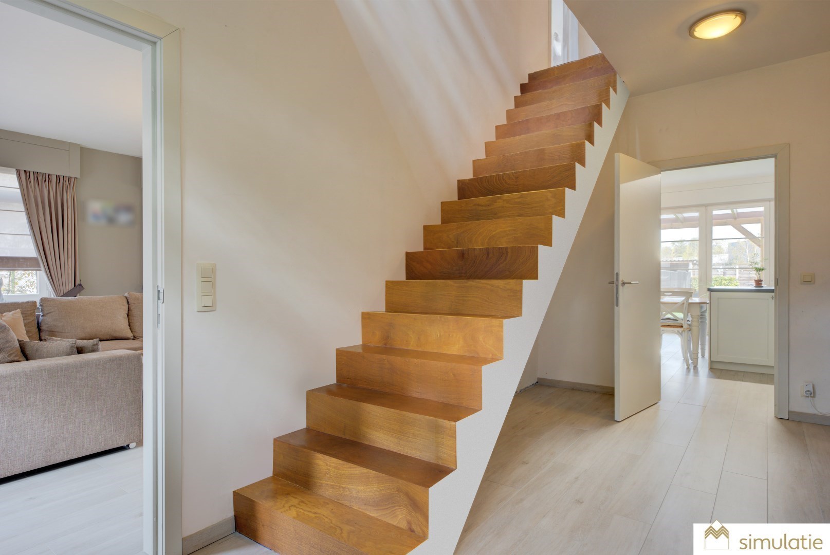 We betreden deze woning via een centrale inkomhal met gastentoilet en vestiaire. Vanuit de inkomhal hebben we toegang tot de keuken en leefruimte. Deze hebben beide zeer veel lichtinval?