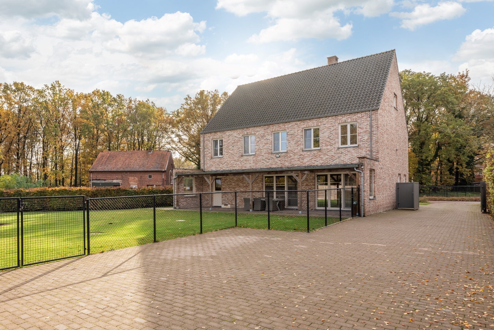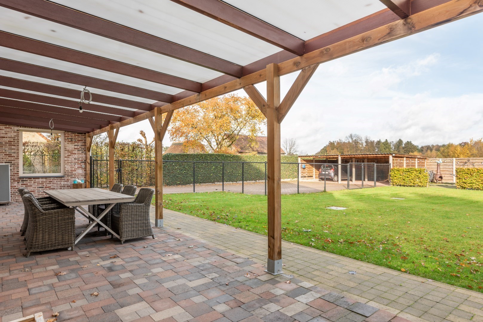Terras overdekt over de breedte van de woning.