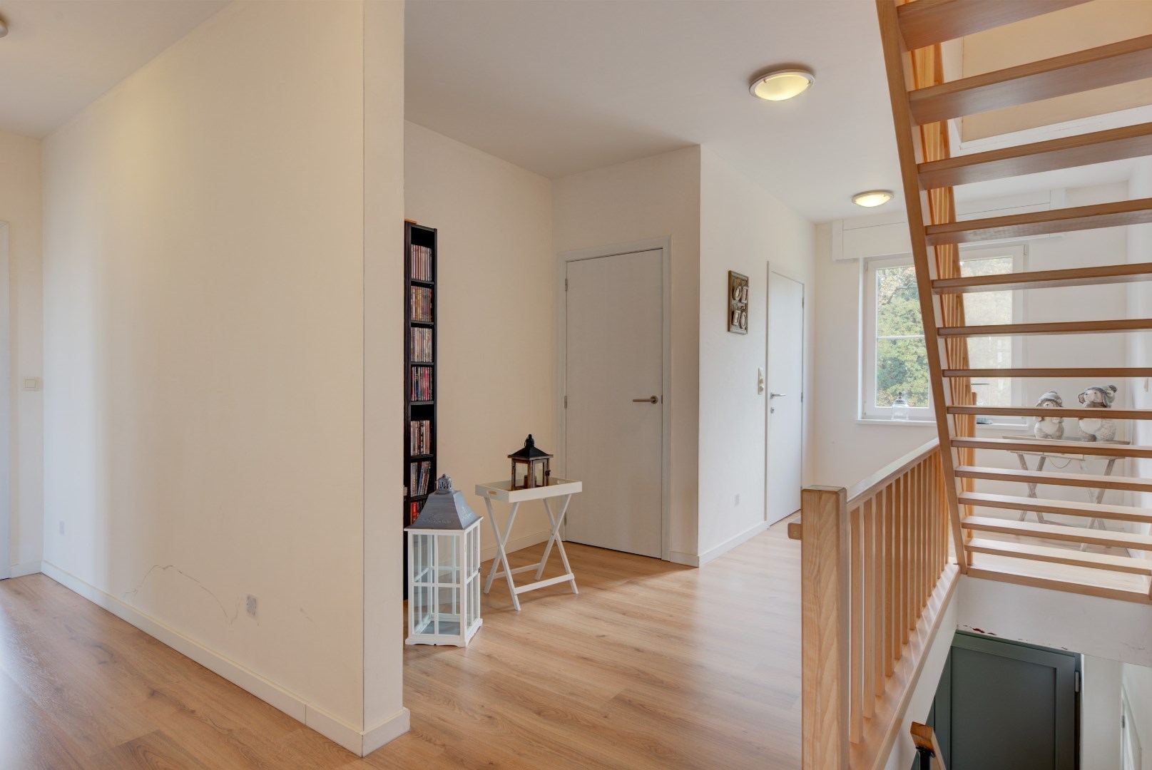 Met de trap in de gang bereiken we de nachthal op de eerste verdieping, deze verbindt de drie slaapkamers en hobbykamer. Er is ook nog een apart toilet en een opbergruimte.